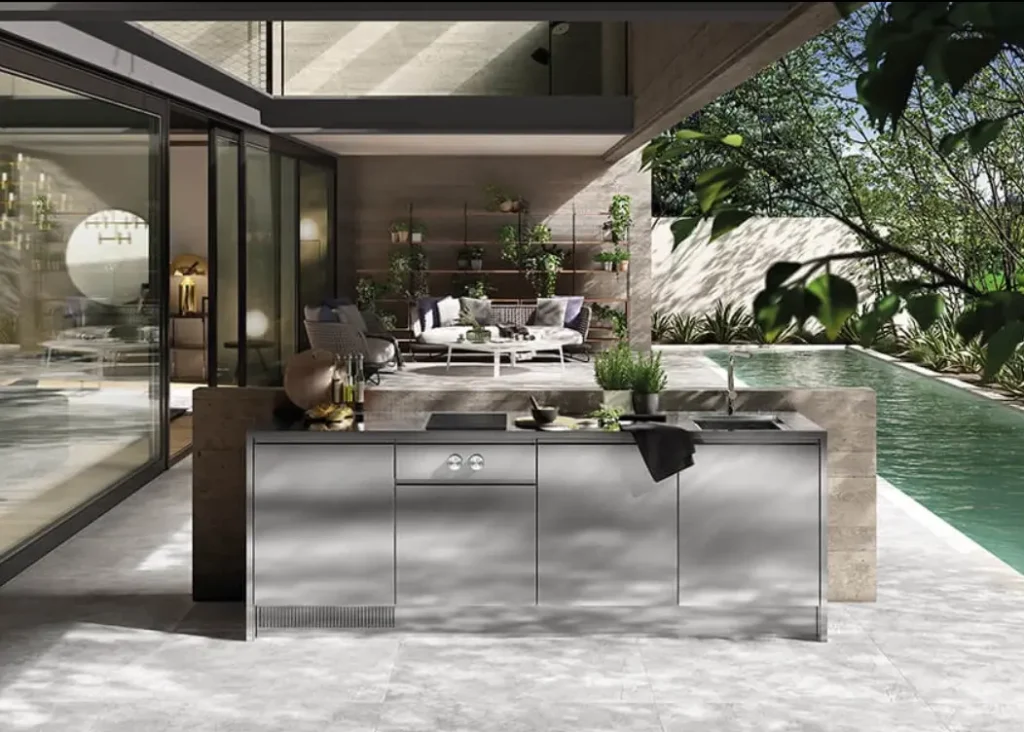 Stainless steel is more commonly used in professional kitchens, but it’s hard to clean off fingerprints and scratches. Stainless steel doesn’t expand and contract like wood, making it a nice option for moisture-rich places.Whether you are planning an indoor or outdoor kitchen, stainless steel kitchens tend to stand the test of time both in quality and aesthetics. The organic natural scenery outdoor create a strong contrast with the clean, sharp lines of this minimal cabinets.But the price will be higher than MDF,particle board and plywood,color option is limited.